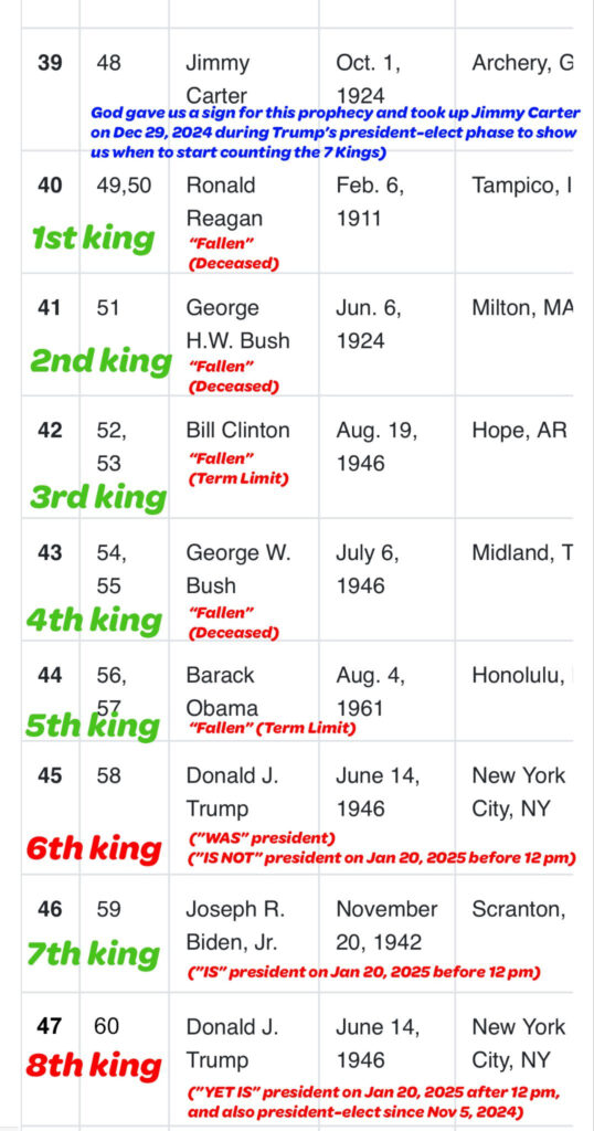 It’s also amazing to note based on the above graphic of the “7 kings (presidents)”, that the 1st one being Ronald Reagan starts right after Jimmy Carter, who died at 100 years old when Trump was president-elect the second time: right in the middle of when Trump was elected again for a second term on November 5, 2025 and his actual inauguration on January 20, 2025. That’s a sign from God Himself.