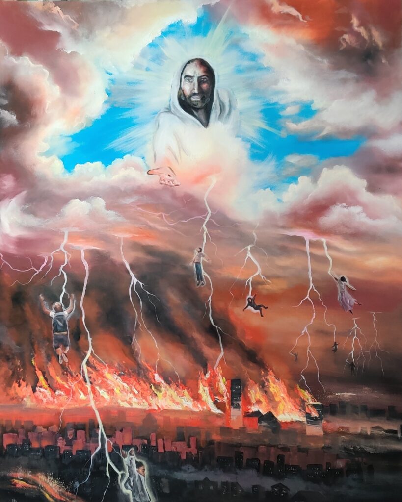 A dear friend and sister in Christ named Kate: I was commissioned to do a different painting in the summer of 2023. When I finished it I said to myself, that may be my last painting, (I was expecting the rapture that Feast of Trumpets). After I said that I had massive whole body Holy Spirit chills. And I said out loud “not my last painting?” And it happened again very noticeably. Right then I knew what I supposed to paint. The prior years I had been fixated on painting fire, I have a natural ability to do portraits, and I recently have fallen in love with painting clouds, so I felt the Lord had prepared me my entire life to paint this exact painting that showcased all of these elements. As I painted I have never felt closer to the Lord and full of the Holy Spirit. I cried so much of the time I was painting and it came together so quickly. I felt like the Lord was painting it through my hand. I knew I needed lightning to show how fast the rapture will happen even though I don’t assume this is how it will literally look. I knew I wanted a city on fire to show how this is a rescue from tribulation. I knew I wanted our Lord’s face to be calm and welcoming. I wanted to remind the audience of His sacrifice on the cross with the wound in His hand. I wanted Him to be the light source in the darkness. I unintentionally painted 8 people being raptured. Now I think that was a sign pointing at 8 years from the revelation 12 sign.